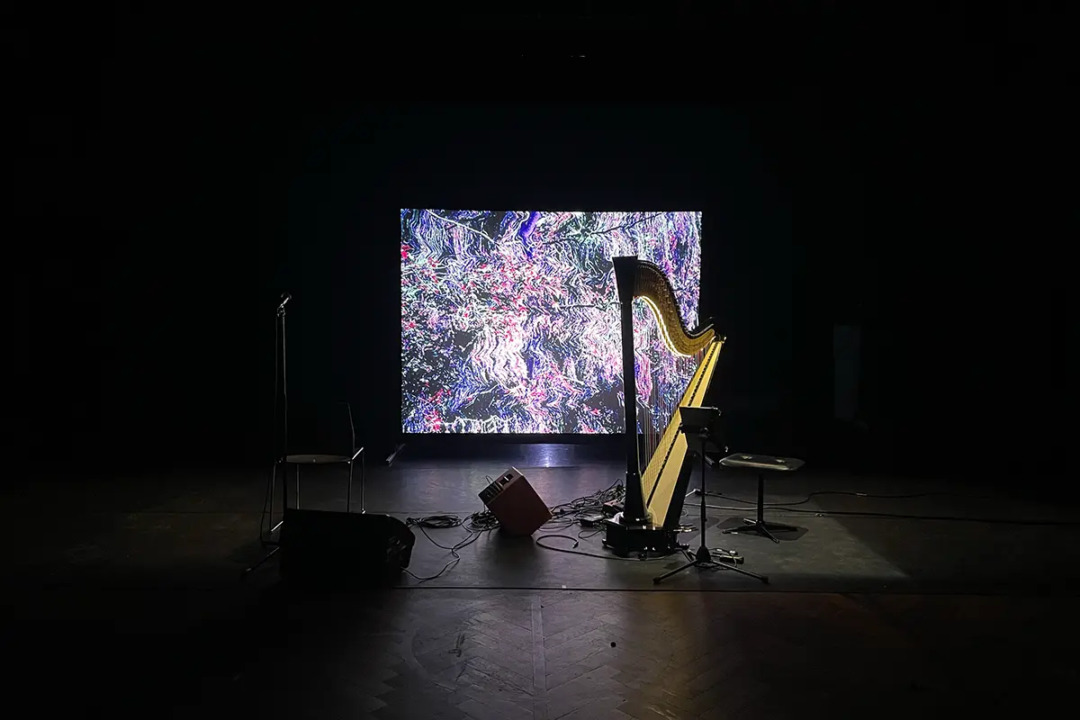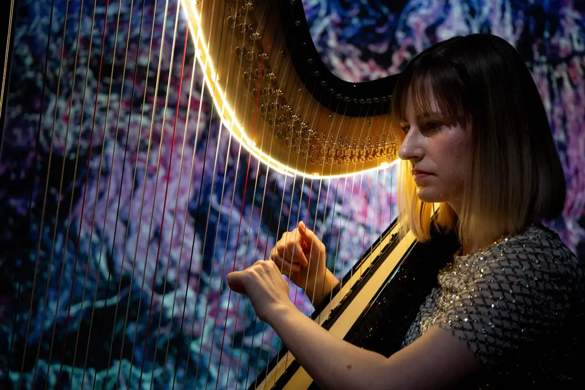 I perform on an electro-acoustic pedal harp, supported by visuals tailored to each piece.